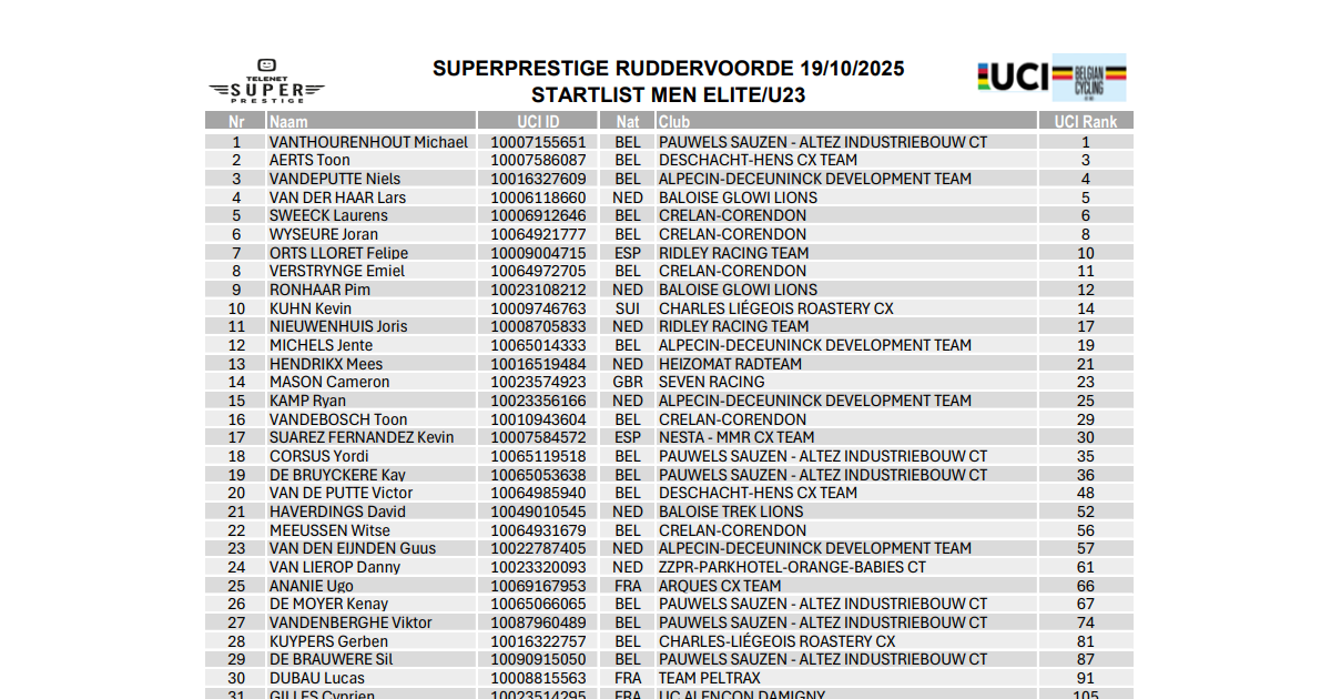 Ruddervoorde 2025 – Startlist Men Elite/U23